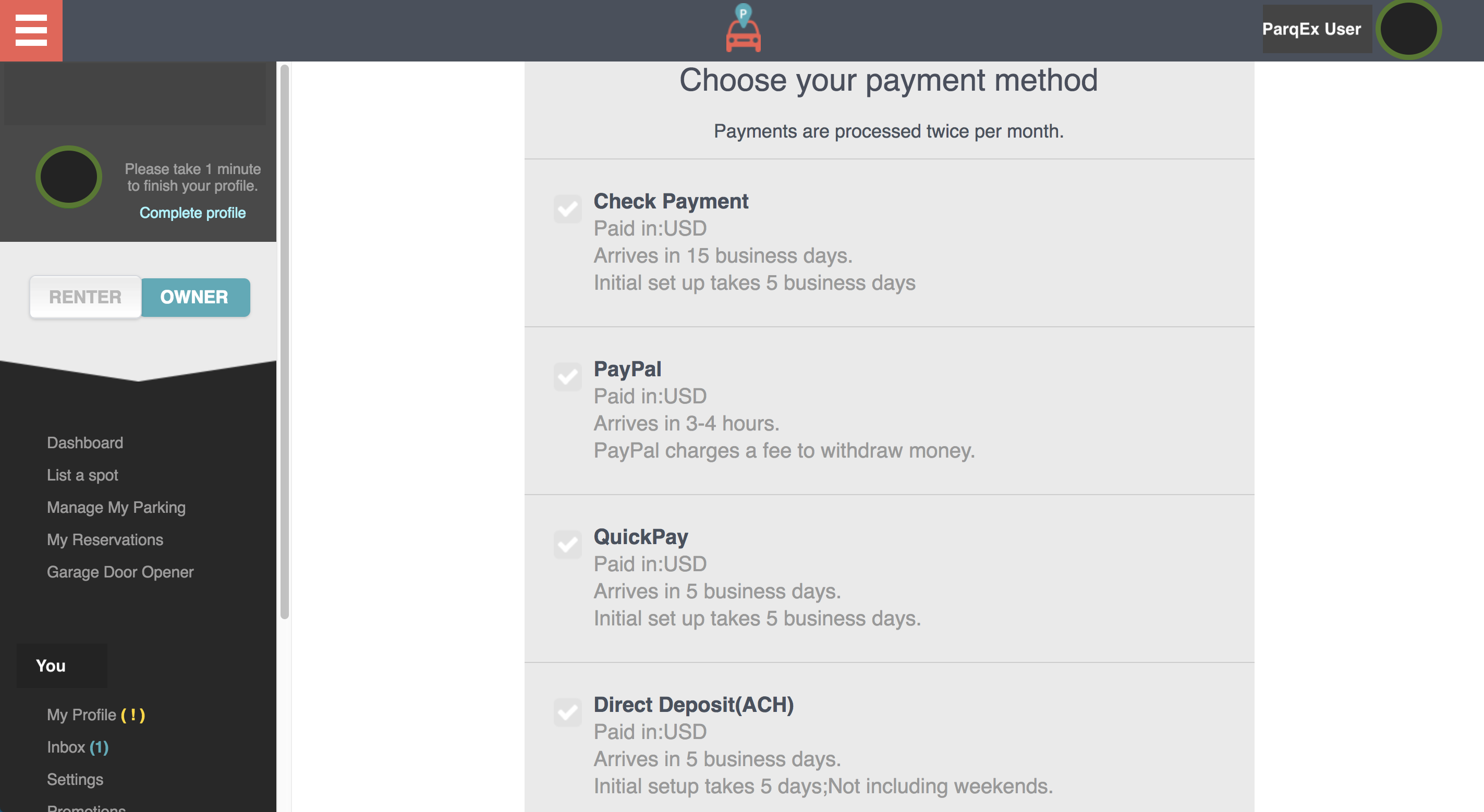 Owners have a number of ways to get paid on ParqEx. Regardless of which payment method is selected, payments are processed on the 1st of each month. Please allow additional time for checks.